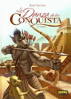 Esta vez es el turno de una saga Europea y más concretamente de un autor mexicano, Raúl Treviño. La saga es LA DANZA DE LA CONQUISTA, uno de esos cómics que tanto me gustan ya que nos trasladará al pasado. La Danza de la Conquista una épica trilogía que combina acontecimientos históricos, mitología y ficción.
